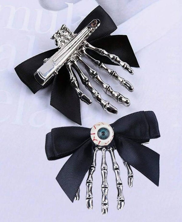 Deze set van twee Halloween haarspeldjes brengt spooky stijl met een knipoog. Elk speldje is handgemaakt en voorzien van een zwarte strik met een opvallend detail: een handje dat óf een mini-pompoentje vasthoudt, óf een mysterieus oog.