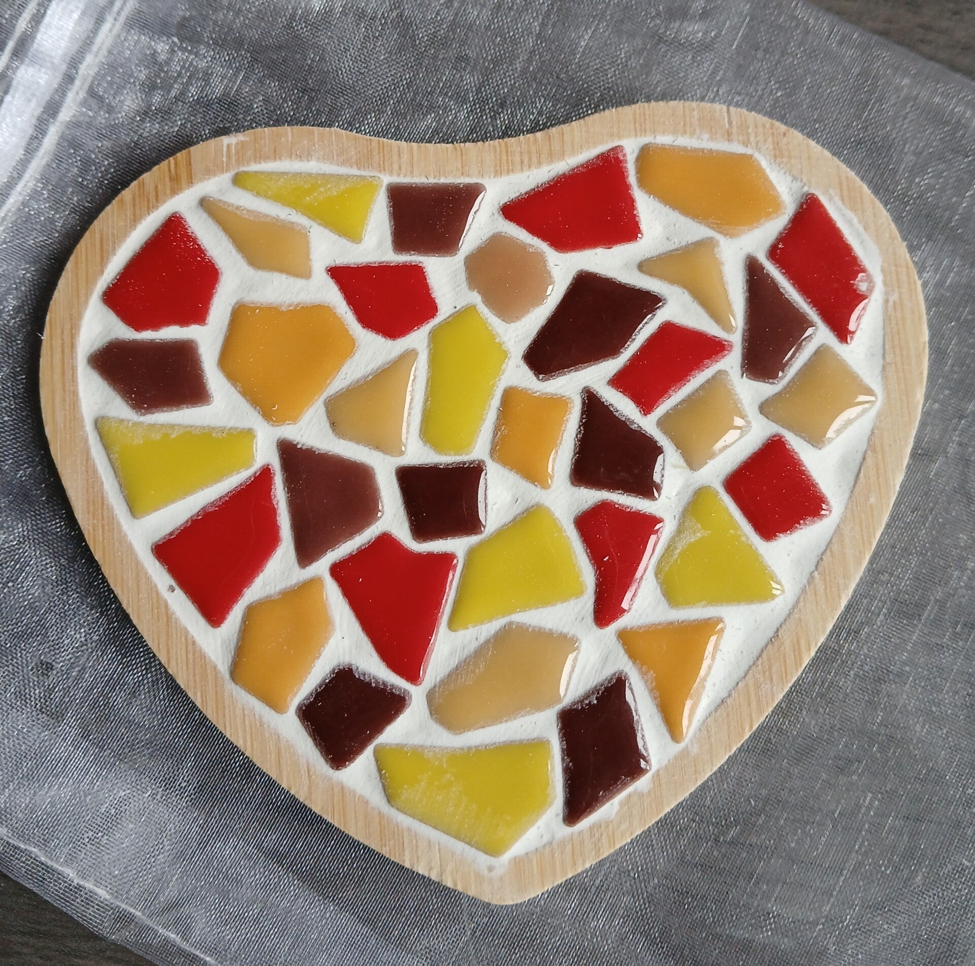 Breng warmte in je interieur met dit handgemaakte mozaïek hart ‘Zonsondergang’. Een houten hartvormige basis, rijkelijk versierd met kleurrijke glas- en keramieksteentjes in tinten van rood, oranje, geel en aardetinten. De willekeurige plaatsing van de steentjes zorgt voor een speels en levendig effect, terwijl het witte voegsel de kleuren laat stralen.