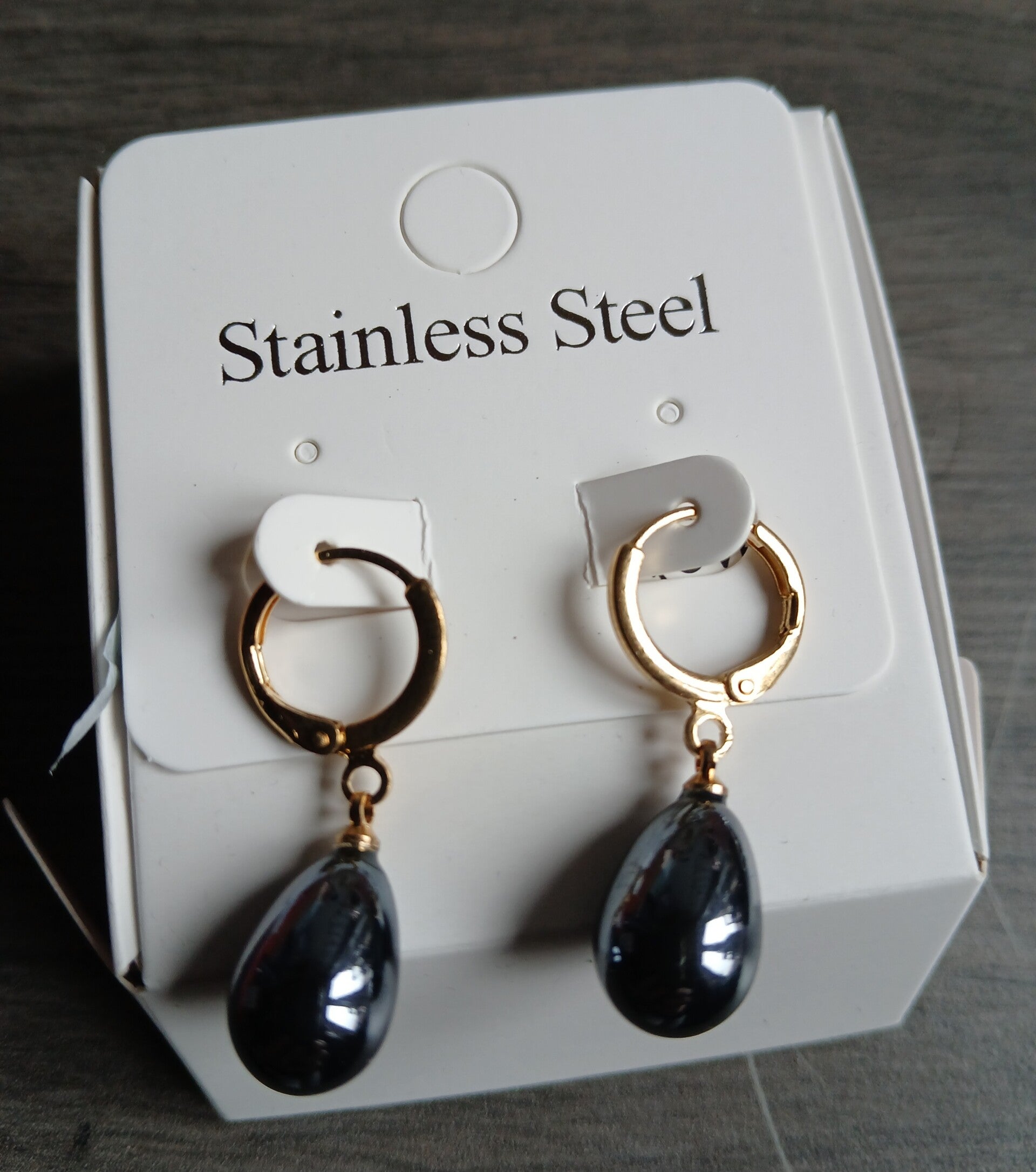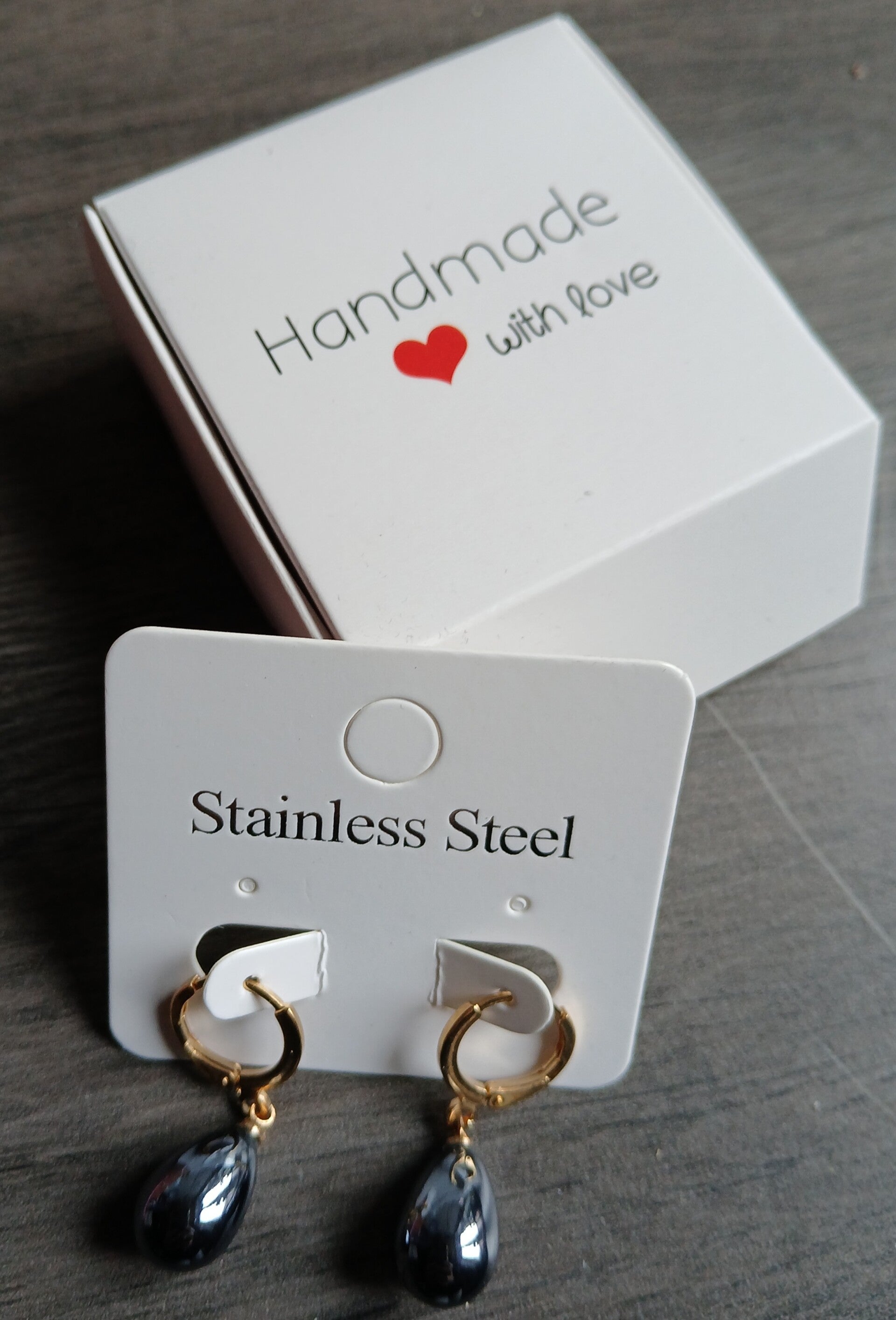 Een verfijnde combinatie van elegantie en ambacht. Deze handgemaakte oorbellen stralen klasse uit met hun gouden huggie hoops en mysterieuze, glanzende druppelvormige hanger in hematietkleur.
