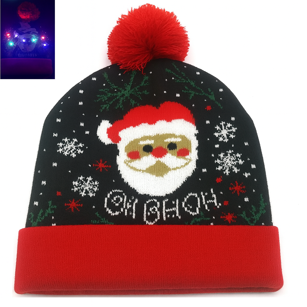 🎅 "Ho Ho Glow – LED Kerstmuts" Breng licht in donkere winterdagen met deze vrolijke gebreide kerstmuts. Santa’s gezicht straalt je tegemoet, omringd door sneeuwvlokken, sterren en de iconische “Ho Ho Ho”-boodschap. Dankzij de ingebouwde LED-verlichting fonkelt de muts letterlijk – perfect voor kerstfeestjes, winterwandelingen of als originele verrassing onder de boom.