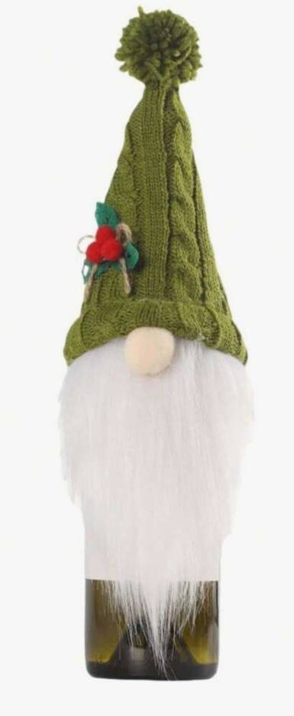 Transformeer je wijnfles in een gezellige kerstkabouter met deze groene gebreide wijnfleshoes, compleet met pompon, witte baard en decoratieve besjes.