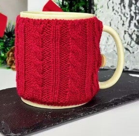 Herbruikbare gebreide hoesjes voor koffiemokken, ontworpen om warmte vast te houden en een gezellige uitstraling te geven. Geschikt voor standaard mokken. Verkrijgbaar in diverse kleuren en patronen, waaronder kabelgebreid en wintermotieven.