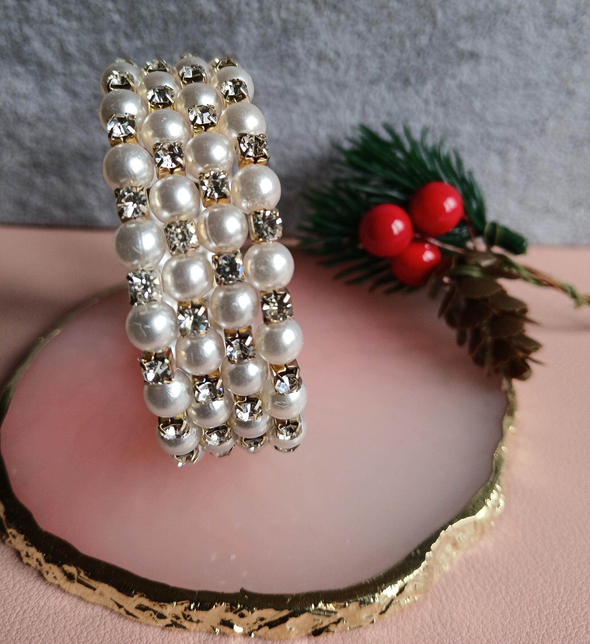 Deze verfijnde armband straalt pure klasse uit met haar afwisseling van glanzende witte parels en fonkelende transparante strass-steentjes, gezet in een goudkleurige basis. Het ontwerp bestaat uit vier symmetrische rijen die een luxueuze en feestelijke uitstraling geven. Perfect te combineren met zowel avondkleding als een stijlvolle dagoutfit. De armband is flexibel en comfortabel om te dragen, en vormt een schitterend accent tijdens de feestdagen.