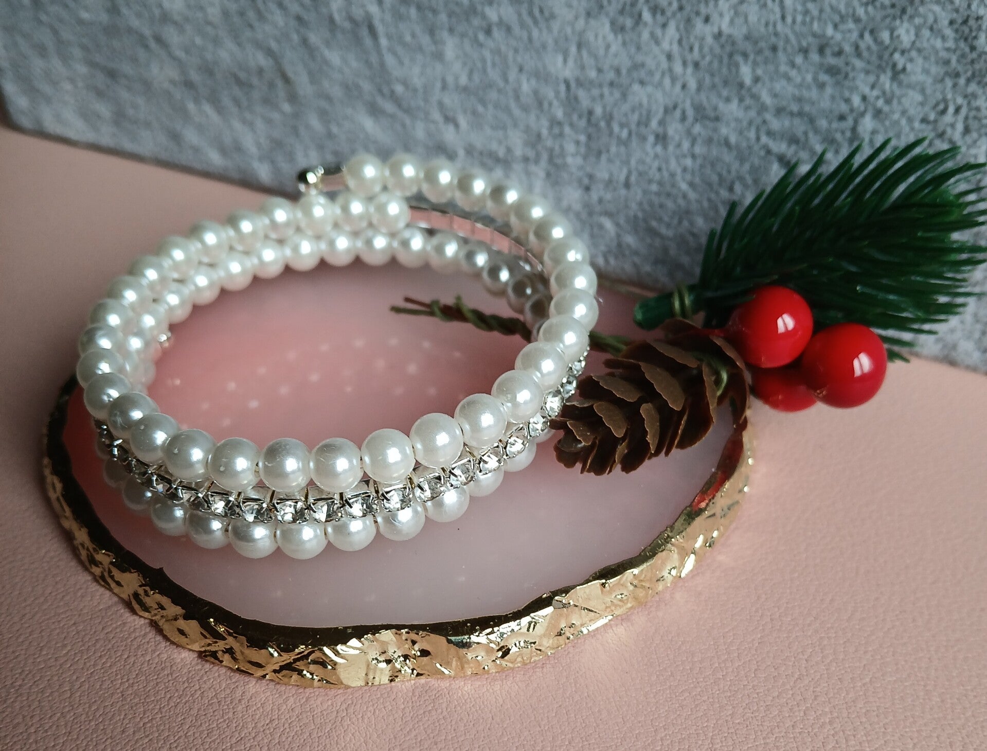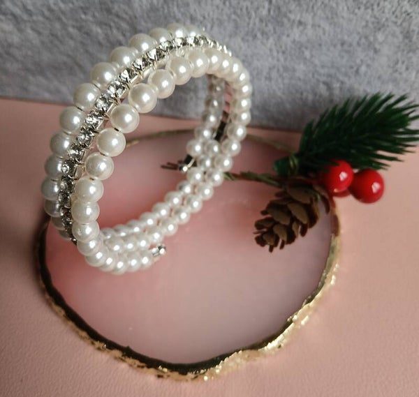 Deze elegante stretcharmband is een verfijnde combinatie van glanzende witte parels en fonkelende strass-steentjes, gezet in goudkleurige metalen prongs. De drie rijen wisselen elkaar af in een harmonieus patroon dat luxe en klasse uitstraalt. Dankzij het elastische ontwerp past de armband comfortabel rond elke pols. Perfect voor feestelijke gelegenheden, bruiloften of als chique accent bij je dagelijkse outfit.