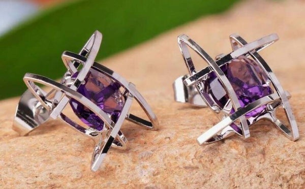 Deze opvallende oorstekers combineren een diepe paarse steen met een architecturaal zilverkleurig design. De facetgeslepen amethistkleurige steen wordt omlijst door een abstracte kooi van glanzende metalen lijnen, die een speels en toch verfijnd effect creëren. Het ontwerp straalt moderne luxe uit en is perfect voor wie houdt van unieke statement pieces met een artistieke flair.