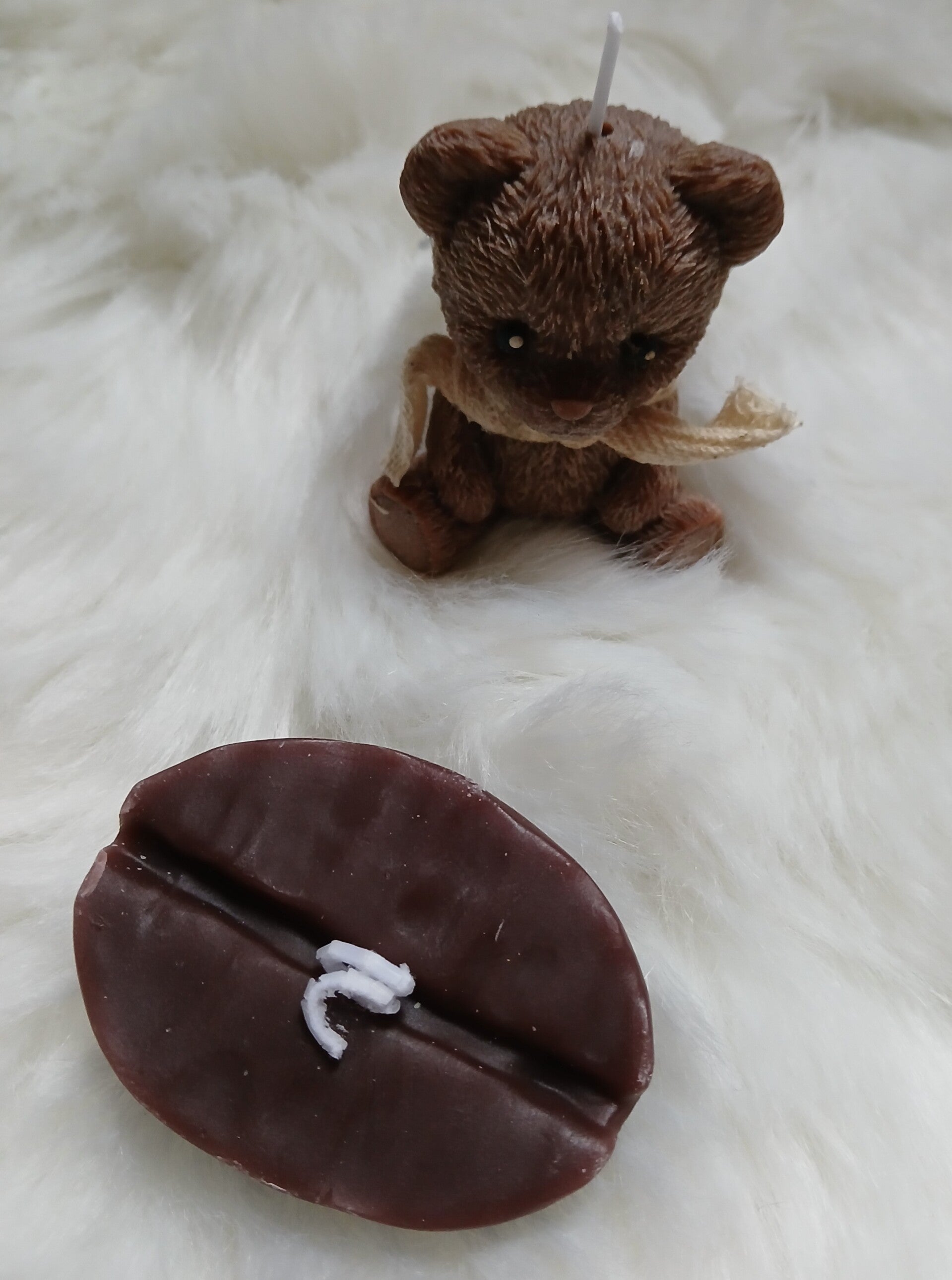 Laat je hart smelten met deze handgemaakte waxfiguurtjes: een pluizige teddybeer met een rustieke touwsjaal en een charmante koffieboon met speelse “n”-vormige lont.