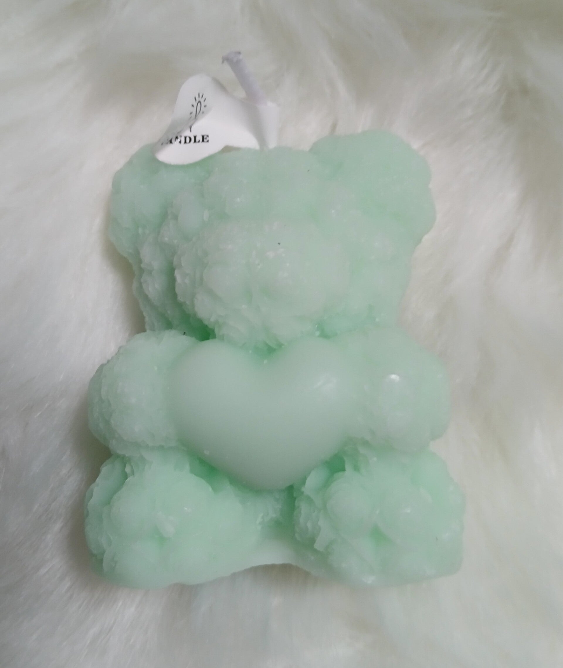 Een frisse knuffel in kaarsvorm: deze mintgroene teddy straalt zachtheid uit met zijn pluizige textuur en hartvormige detail.