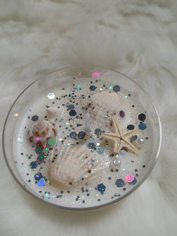 Laat je meevoeren op een golf van geur en glitter. Deze ronde geurkaars is een kunstwerk in hars, gevuld met echte schelpjes, pareltjes, een stervormige verrassing en fonkelende glitters in zilver, blauw en roze.