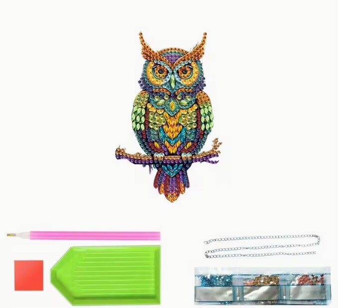 Deze diamond painting kit toont een levendige uil met een mix van oranje, blauw, groen, geel en paars rhinestones. Het ontwerp is rijk aan kleur en detail, ideaal voor decoratie of als creatief cadeau.